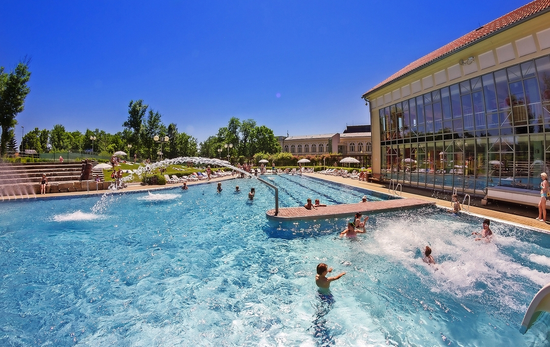 drei Innen- und zwei Außenbecken mit Wasserattraktionen sowie zwei Whirlpools gilt als schönste und größte Badelandschaft des Böhmischen Bäderdreiecks.