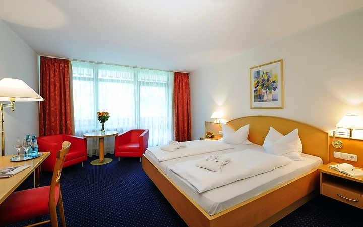 Die 184 Zimmer des Hauses sind mit dusche/WC, Fön; Leihbademantel, Sat.-TV, Radio, Telefon, kostenfreiem Internetzugang (WLAN), Kühlschrank, Wertfach und Balkon ausgestattet. Die Komfort Immer (gg. Aufpreis) verfügen zusätzlich über einen schönen Gartenblick. Einzelzimmer sind Doppelzimmer zur Alleinbenutzung.